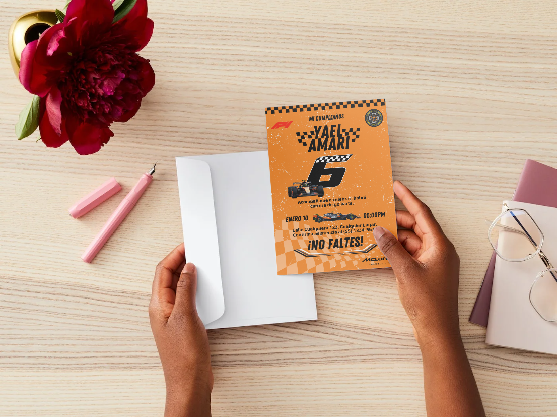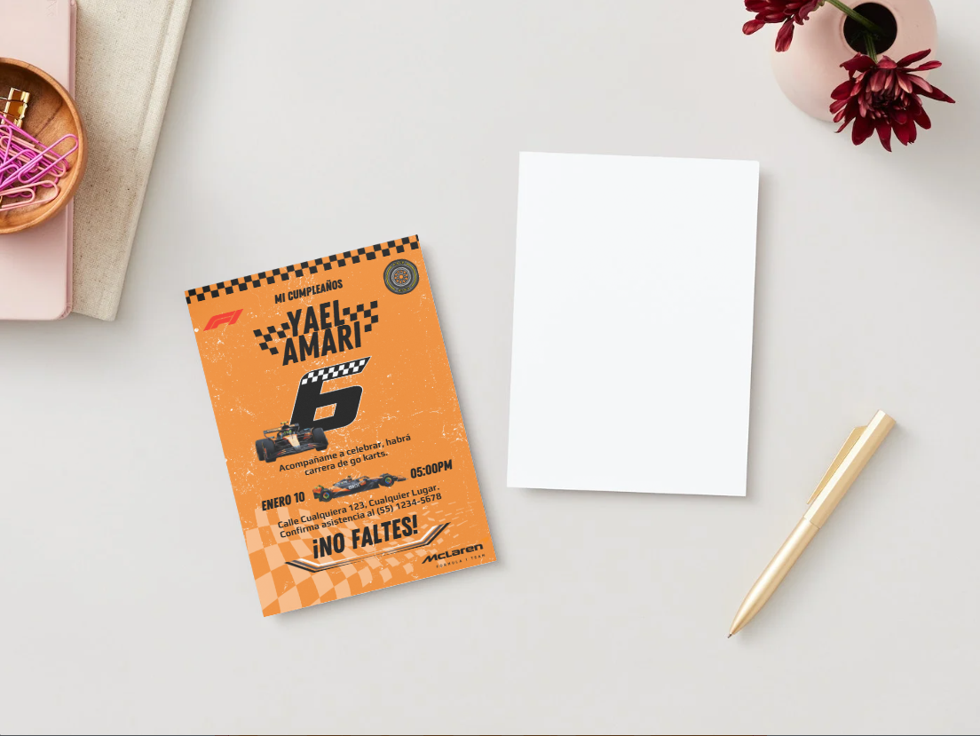 Incluye un diseño deportivo con autos McLaren, textura metálica y colores vibrantes, que podrás personalizar fácilmente con el nombre, edad, fecha, hora y lugar del evento. 🎉💥