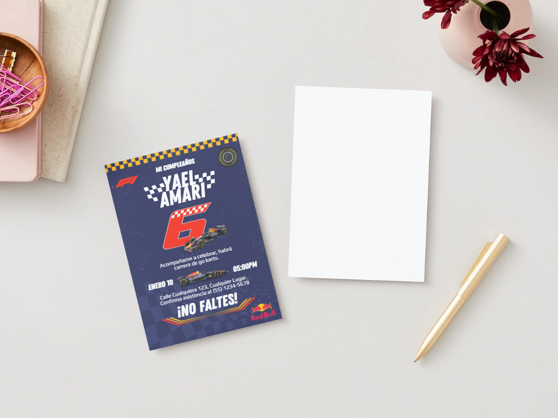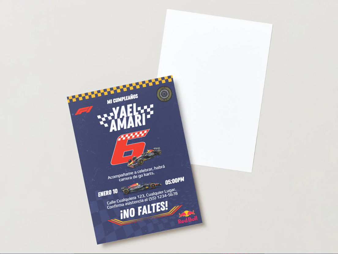 Diseñada con los colores vibrantes de Red Bull, autos de alta velocidad y detalles de pista 🏎️💨, podrás personalizar fácilmente con el nombre, edad, fecha, hora y lugar del evento. 🎟️✨
