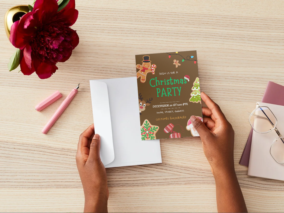Incluye diseños con galletas de jengibre, dulces navideños, renos, Santa, colores cálidos y detalles encantadores que podrás personalizar con los datos de tu evento (nombre, fecha, lugar, frase especial y más).